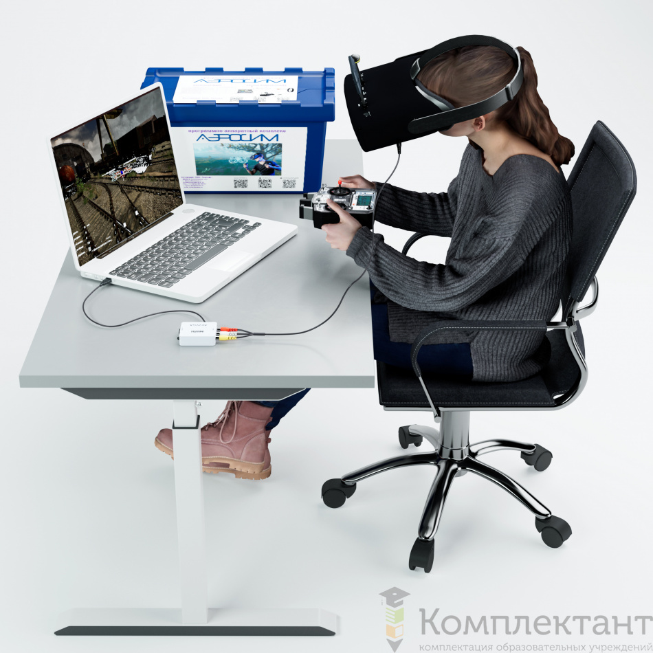 ПАК содержит в комплекте все необходимые компоненты для безопасного и быстрого старта обучения пилотированию БПЛА в ручном режиме. В комплекте идет пульт и шлем, которые можно также использовать в дальнейшем для пилотирования реальными БПЛА в режиме FPV (First Person View, «Вид от первого лица»). Через специальный конвертер возможно вывести изображение с экрана ноутбука на шлем.