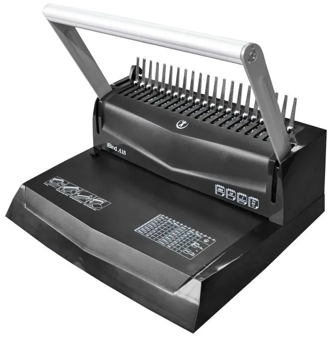 - iBind A15 обладает современным дизайном и оснащена удобной ручкой для перфорации отверстий в бумаге.