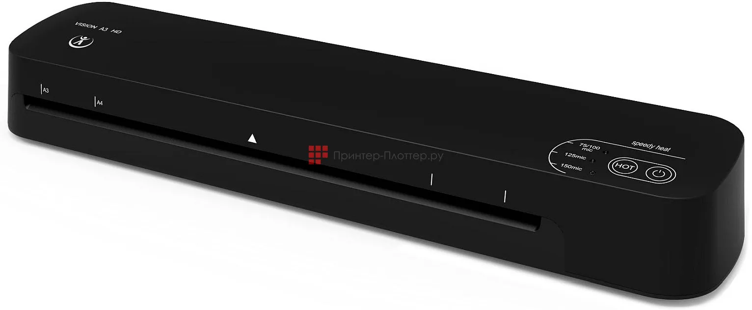 Немного подробнее: в ламинатор была добавлена регулировка температуры для работы с пленками толщиной 75/100, 125 и 150 мкм! А для удобства пользования было добавлено сразу несколько технологий и опций: "Speedy Heat" — быстрый нагрев и готовность к работе за 1 минуту; сенсорная панель управления; индикация толщины пленки; автоматический переход ламинатора в дежурный режим через 30 минут работы. И все это собрано в стильном компактном и прочном корпусе из высококачественного пластика. Vision A3 HD отличается от Vision A4 HD шириной и толщиной ламинирования, а также мощностью.