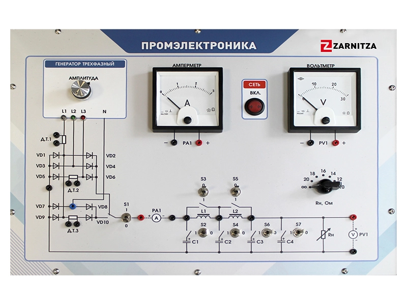 Комплект учебно-лабораторного оборудования "Промэлектроника" предназначен для исследования неуправляемых выпрямителей однофазного и трехфазного тока и сглаживающих фильтров на лабораторных занятиях.