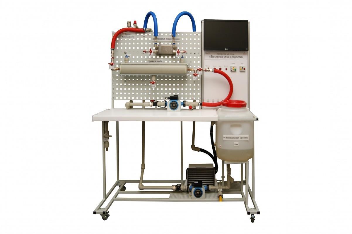 Комплект учебного лабораторного оборудования «Теплотехника жидкости» позволяет экспериментально определить коэффициент теплопередачи и теплоемкости, изучить работу теплообменного аппарата, на примере пластинчатого теплообменного аппарата и аппарата типа «Труба в трубе», а также определить вязкость и теплоемкость жидкости при различных температурах. Датчики температуры, установленные на входе и выходе горячего и холодного теплоносителя, позволяют определять их температуры, а возможность изменения направления течения дает возможность изучить влияние схемы течения на эффективность работы теплообменного аппарата. Информационно-измерительная система стенда позволяет: определять давление, расходы (объемным способом), скорости течения жидкости в разных точках системы.