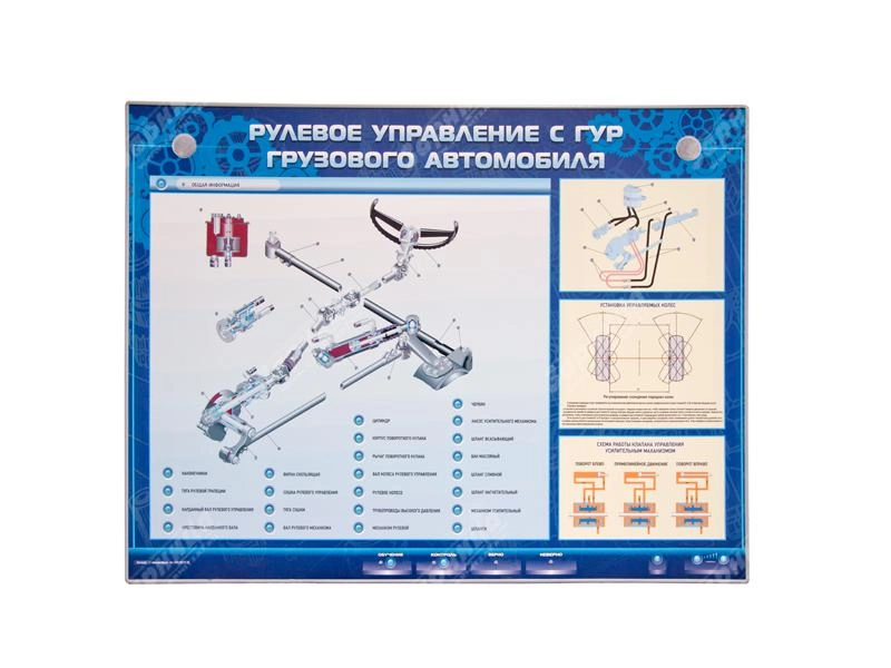 Интерактивный стенд предназначен для получения знаний об устройстве системы рулевого управления с ГУР грузового автомобиля и его основных конструктивных элементов.Комплектация