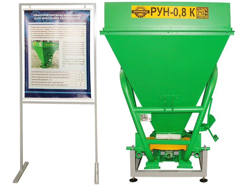 Комплект наглядно-демонстрационного оборудования представляет собой машину для внесения удобрений, размещенную на стационарном основании, оснащенным информационным стендом, поясняющим принцип работы демонстрируемого устройства.