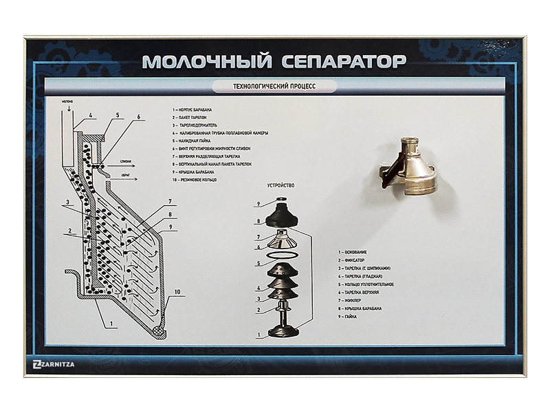 Стенд представляет основные элементы молочного сепаратора, закрепленные на жестком основании с цветографическим изображением.