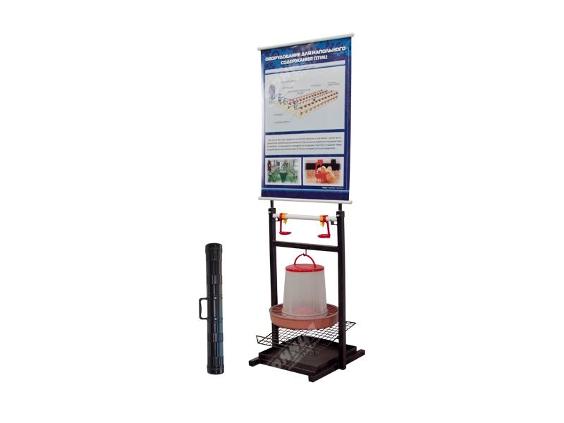 Стенд-планшет "Оборудование для напольного содержания птицы" представляет основные элементы оборудования для напольного и клеточного содержания птицы, закрепленные на жестком основании с баннером.