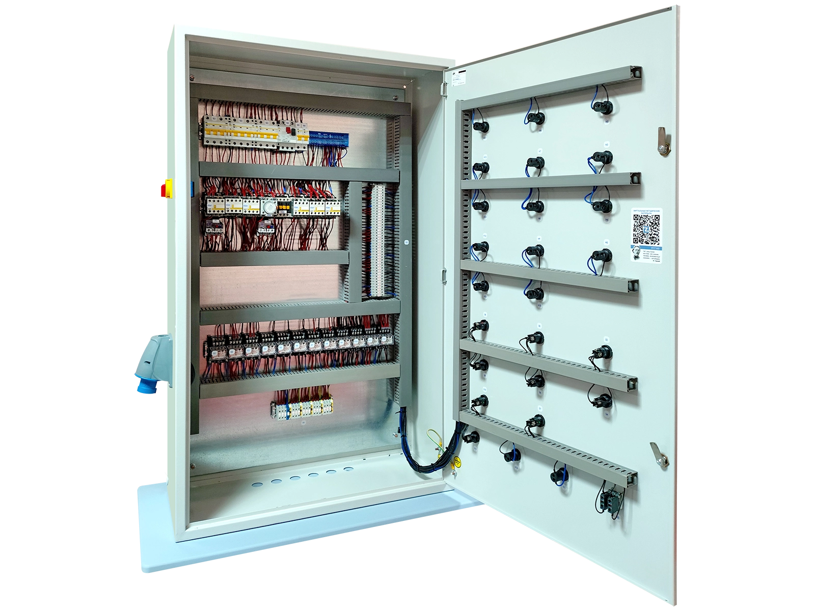 Лабораторный стенд "Поиск неисправностей электромонтажа" представляет собой смонтированный электротехнический шкаф настольного исполнения, предназначенный для управления асинхронными электродвигателями на базе релейно-контакторной логики и поиска неисправностей. В шкафу реализованы цепи управления тремя асинхронными электродвигателями.