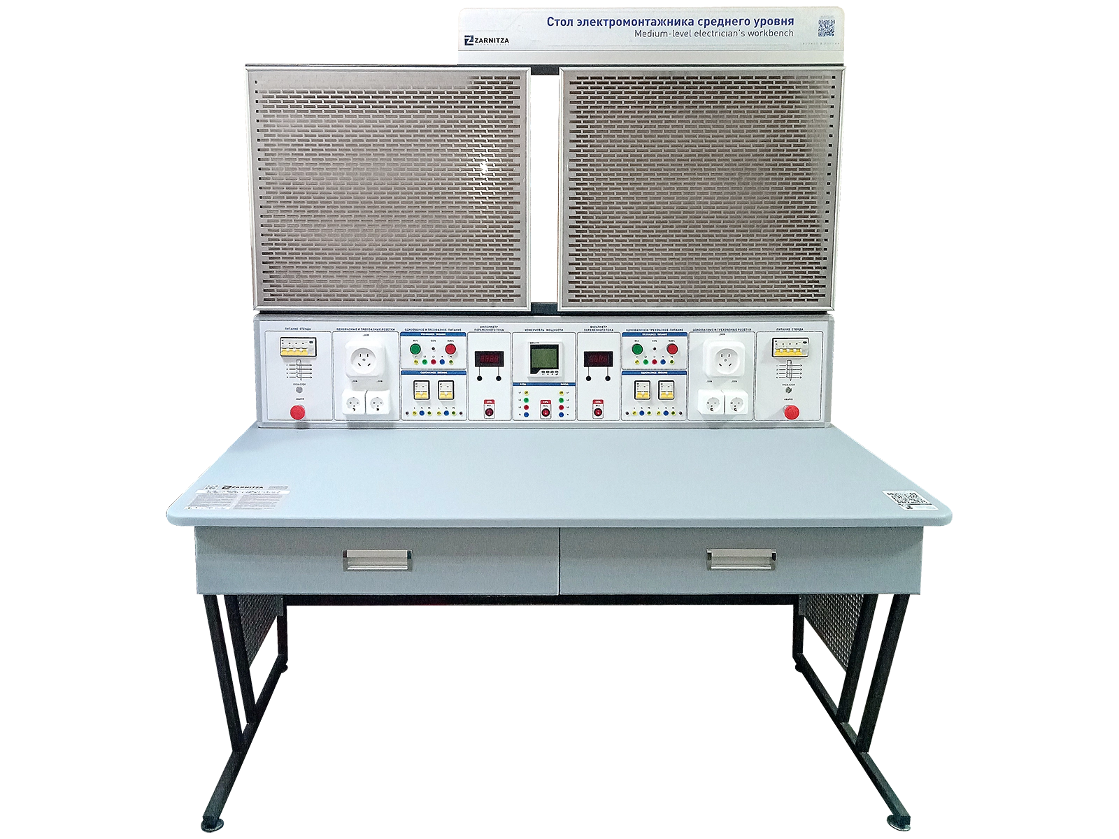 Стенд для подготовки электромонтажников и электромонтеров с измерительным блоком представляет собой стол с выдвижными ящиками, на котором установлен блок электрического питания, блок измерительных приборов и рама для навешивания двух перфорированных панелей из нержавеющей стали. Элементы электрического монтажа закрепляются в отверстиях перфорированной панели с помощью пластиковых клипс и крепежных элементов. Стенд рассчитан на два рабочих места.