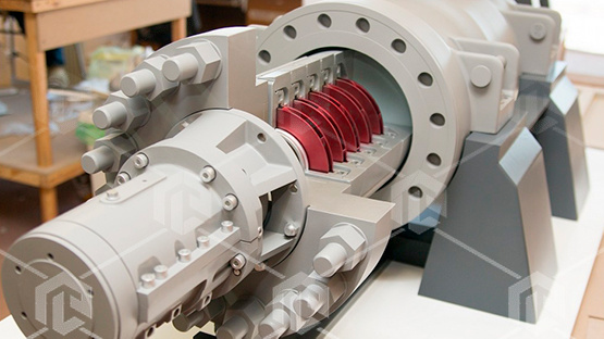 Макет имеет высокую детализацию всех конструктивных элементов насоса. Также для осмотра и изучения внутреннего устройства насоса в основных его элементах сделаны вырезы.