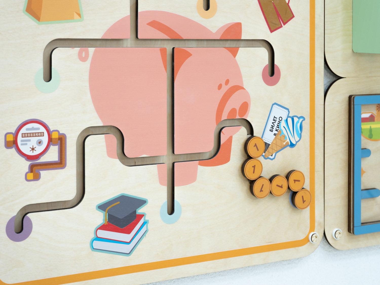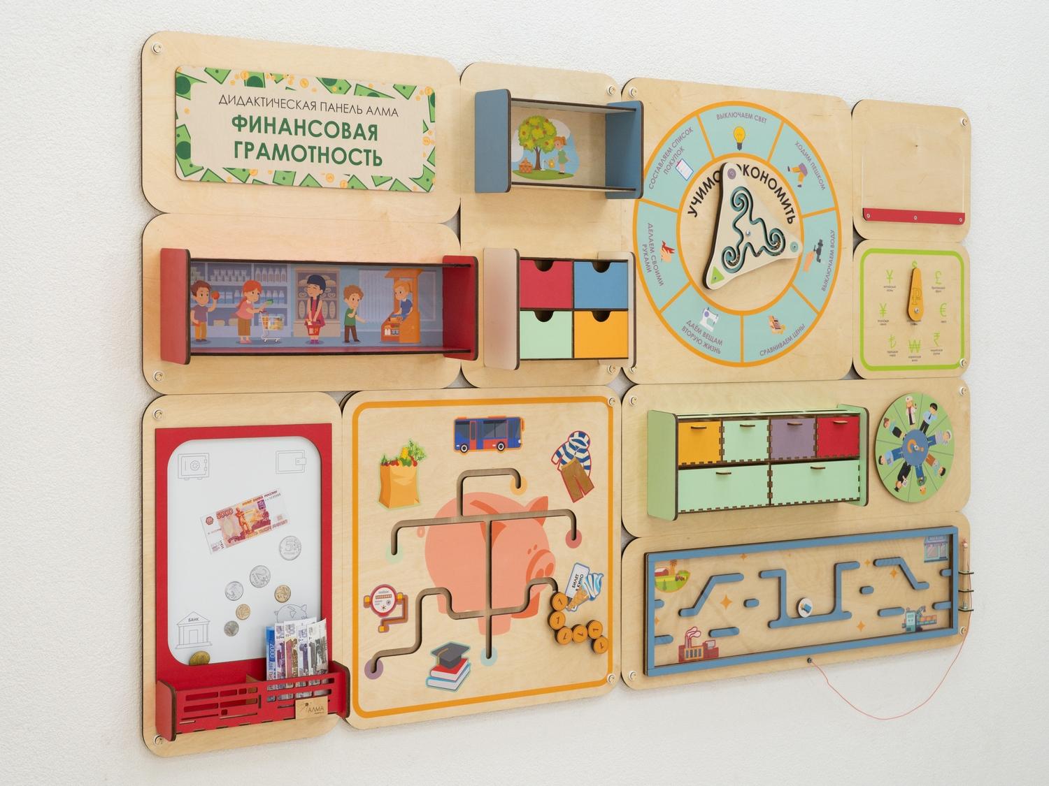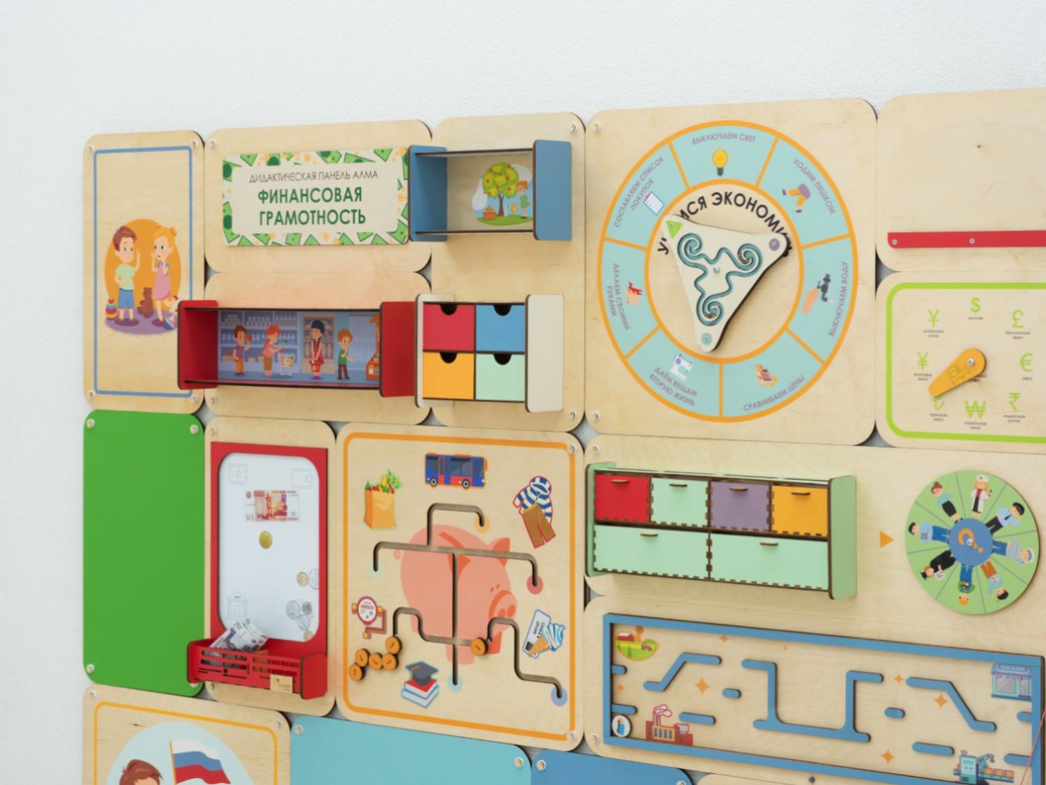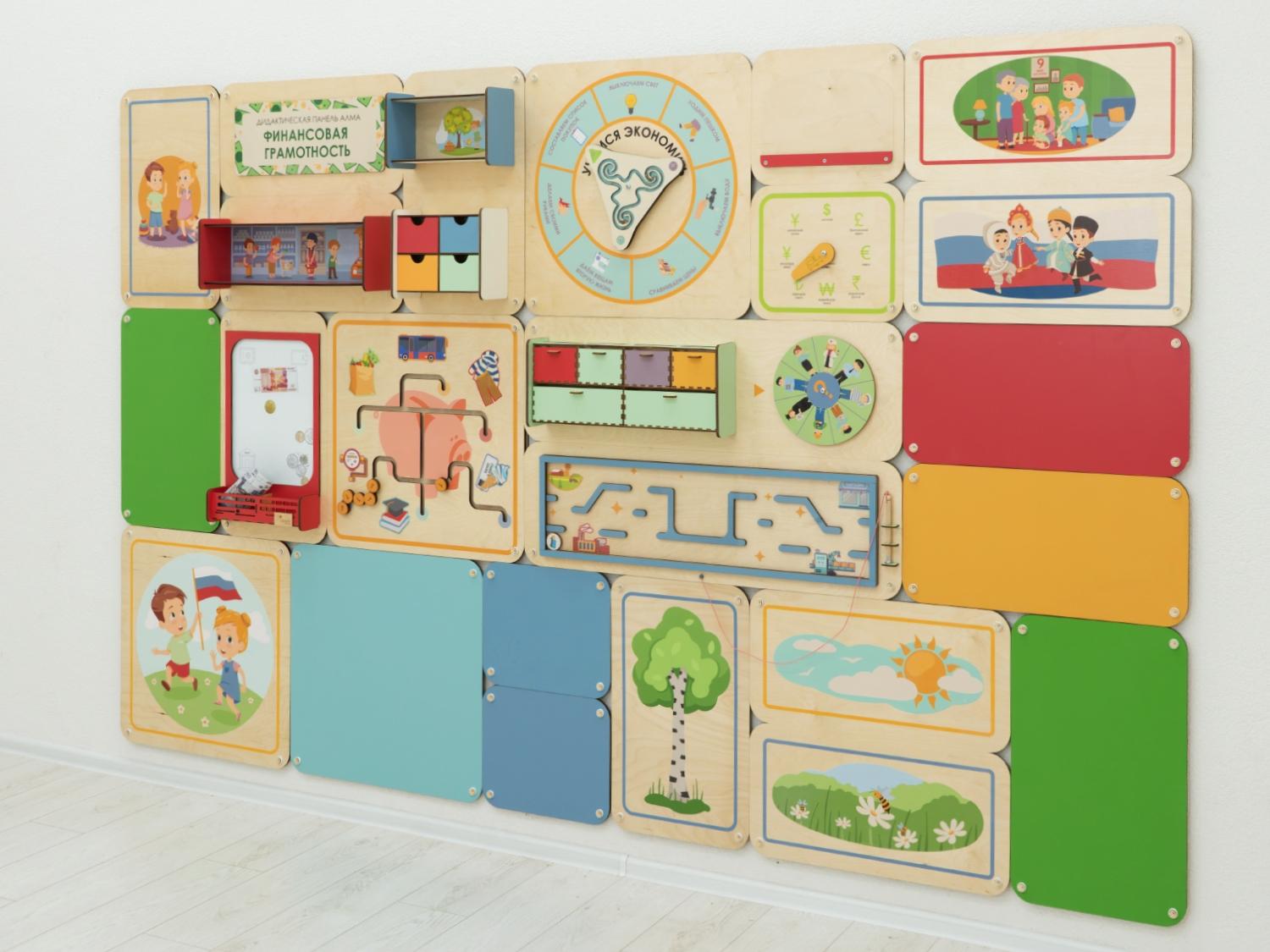 Образовательно-развивающая настенная панель для обучения дошкольников в детских учебных учреждениях основам финансовой грамотности. Игровые элементы по системе Монтессори развивают мелкую моторику детей, а подробное методическое руководство помогает педагогам в проведении занятий. Подходит для оснащения детских садов и учреждений дополнительного детского образования.
