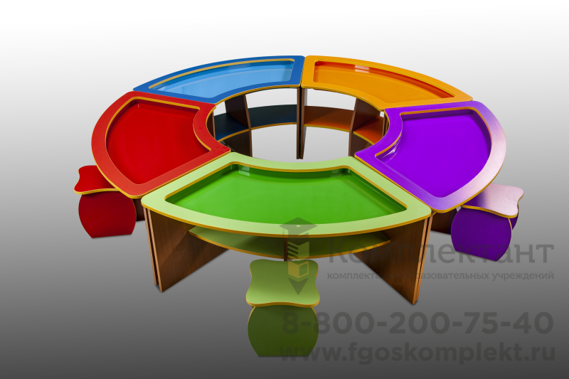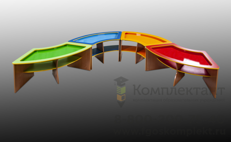 - Данный тактильный комплекс состоит из 5-ти независимых столов со специальными углублениями для работы с песком.