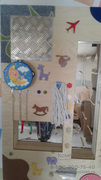 Панель сочетает в себе функции тактильной, зрительной, звуковой стимуляции, развития мелкой моторики и игровой терапии. Разнообразное наполнение сделает эту панель одним из главных элементов и сенсорной, и детской игровой комнаты. Размеры панели позволяют одновременно играть с ней нескольким детям