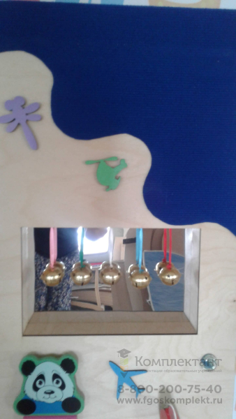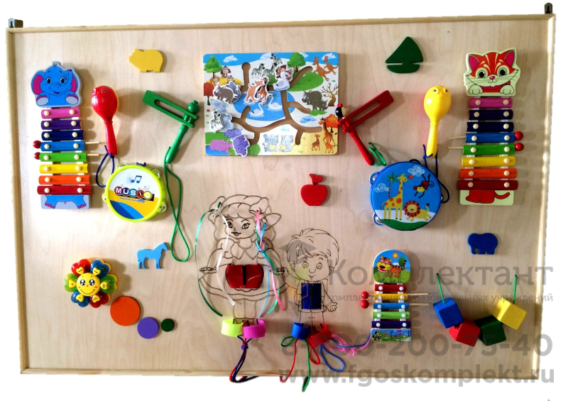 Изделие представляет собой панель, на которой размещены различные музыкальные инструменты, а также тактильные элементы разных форм и цветов. При игре с панелью дети знакомятся с различными звуками, открывают для себя новые ощущения.