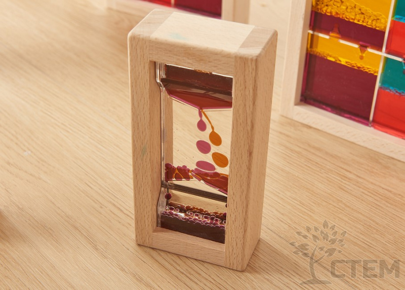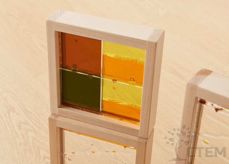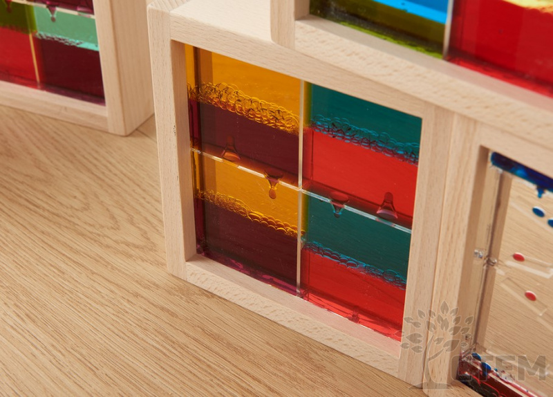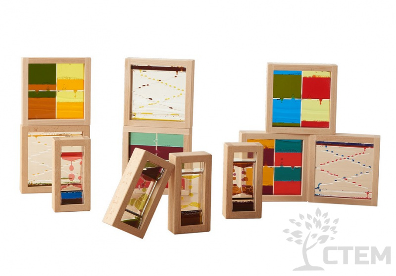 Игровой набор представлен в виде 10 деревянных блоков с акриловыми вставками, заполненными разноцветной жидкостью внутри. Эти "активные" сенсорные кубики с пузырьками движения жидкости заинтересуют и удивят детей. При переворачивании жидкость внутри начинает двигаться, разделяться и пузыриться либо вверх, либо вниз, создавая удивительные формы и узоры. Дети наглядно увидят смешивание различных цветов.