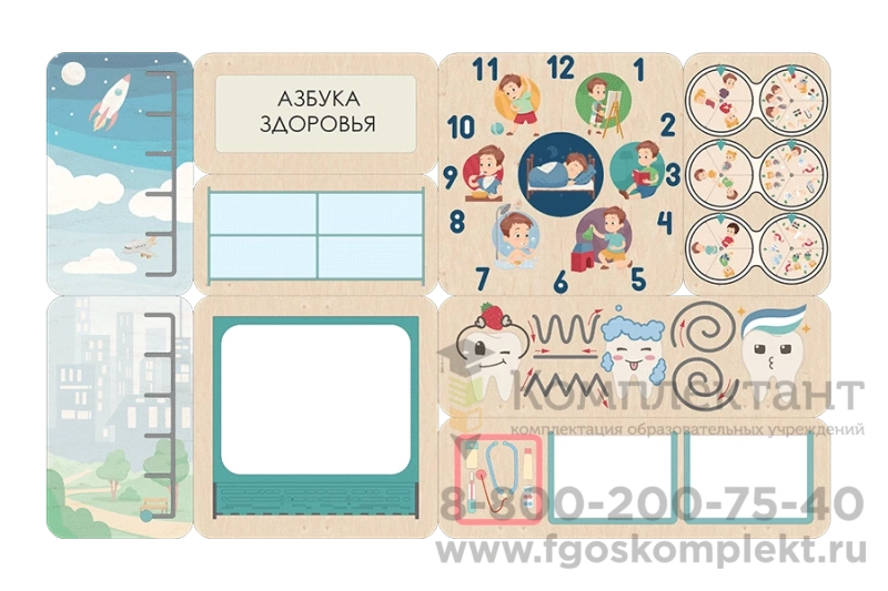 Комплектация: Название игровой панели “Азбука здоровья”, Ростометр, Тело человека, График дня, Бизиборд, Чистка зубов, Проверка зрения, Первая медицинская помощь, Информационный стенд – 2 шт, Дидактическая игра – Карточки, Комплект монтажа, Методическое пособие
