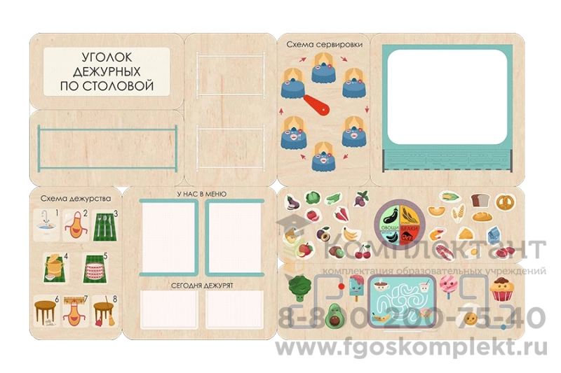 Комплектация: название игровой панели “Уголок дежурных по столовой”, Магнитный модуль по здоровому питанию, Вешалки, Схема дежурств, Схема сервировки, Лабиринт, Меню питания, Дежурные, Информационный стенд – 2 шт, Дидактическая игра – Карточки, Комплект монтажа, Методическое пособие