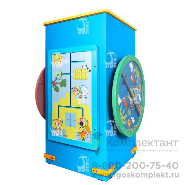 Изделие представляет собой тумбу, на которой расположены развивающие панели. Такая тумба хорошо подойдёт тем помещениям, где нет свободного места на стенах. Вы можете создать уникальную игровую и развивающую систему, используя различные игровые модули.