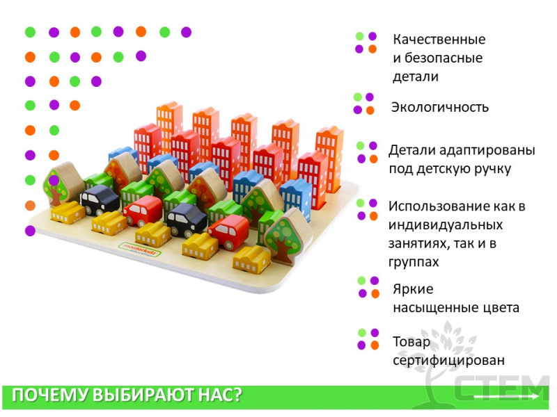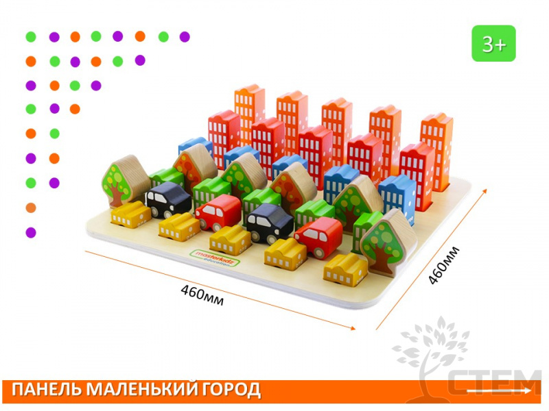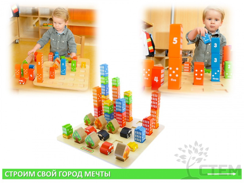 - 25 зданий пяти разных высот (каждое здание имеет количественную маркировку в виде точек от 1 до 5, соответствующую цифровую маркировку от 1 до 5 и обозначение цифры на английском языке),