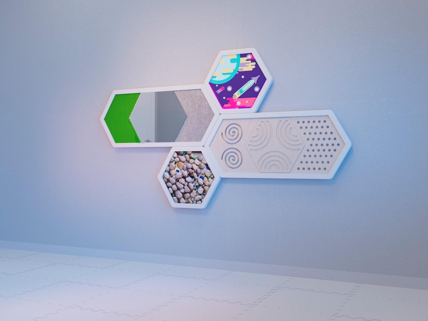 Состоит из четырёх шестигранных панелей, покрытых различными материалами: ворс, пайетки, дерево, металл, акриловый пластик, зеркало, натуральный камень. Благодаря различным фактурам, рельефам, звукам и температурным ощущениям ребёнок приобретает новый тактильный опыт, учится классифицировать материалы по отдельным категориям и сравнивать их свойства. Это хорошо отражается на развитии малышей, ведь чем разнообразнее палитра тактильных ощущений, тем лучше развивается мозг, в частности, зоны, отвечающие за анализ информации и развитие речи.