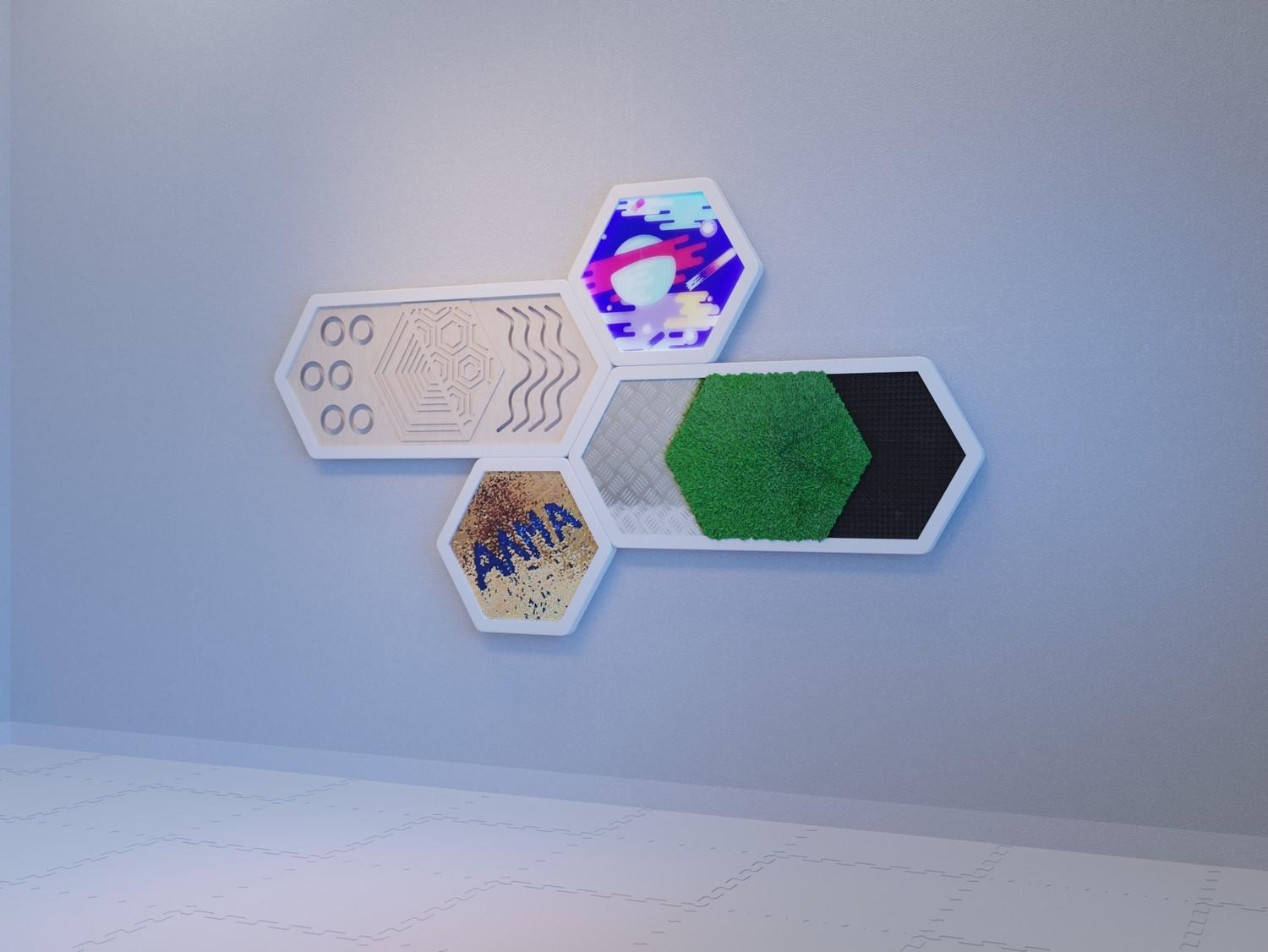 Состоит из четырёх шестигранных панелей, покрытых различными материалами: ворс, пайетки, дерево, металл, акриловый пластик, зеркало, натуральный камень. Благодаря различным фактурам, рельефам, звукам и температурным ощущениям ребёнок приобретает новый тактильный опыт, учится классифицировать материалы по отдельным категориям и сравнивать их свойства. Это хорошо отражается на развитии малышей, ведь чем разнообразнее палитра тактильных ощущений, тем лучше развивается мозг, в частности, зоны, отвечающие за анализ информации и развитие речи.