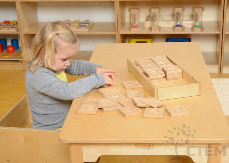 Набор состоит из 40 плиток, на которых выгравированы буквы английского алфавита, цифры и различные фигуры. Ребенок, ведя пальцем по рисунку плитки, активизирует тактильные ощущения, тренирует координацию движений, познает буквы английского алфавита, цифры и основные геометрические фигуры, учится концентрации внимания.