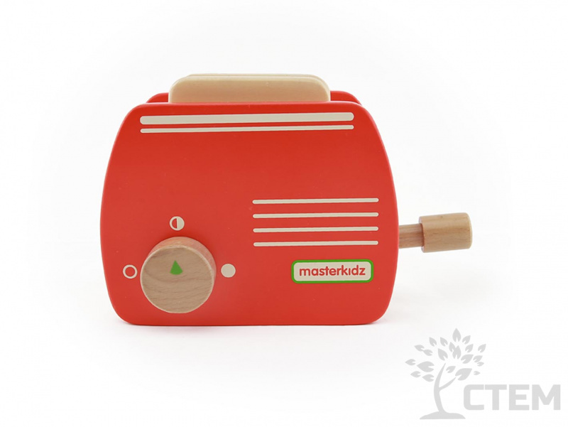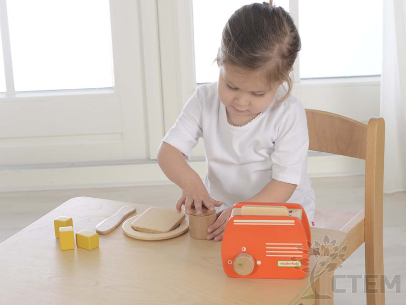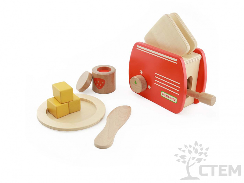 Набор состоит из 9 предметов: цветного деревянного тостера, имеющего ручку управления для включения, ломтиков хлеба, кусочков масла, баночки с джемом, ножа и тарелки.