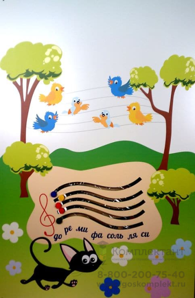 Дидактическая панель с настенным креплением. Изображает нотный стан. Имеет прорези с движущимися по ним рычажками. Имеет изображение скрипичного ключа, а также надписи с названиями каждой из семи нот. Помогает ребенку развивать моторику, логическое мышление, знакомит его с элементарными музыкальными элементами — нотами.
