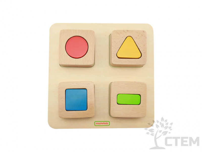 Пособие представляет из себя панель с 4 парами деревянных блоков в 4 различных формах и цветах. Панель предназначена для развития моторных навыков, логического мышления, а также для знакомства с формой и цветом. Размеры: 28*28*3см