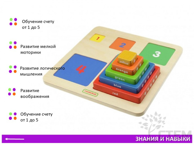 Пособие представляяет собой панель с набором из 5 блоков различных по размеру, цвету, цифре и соответствующему количеству точек. Предназначена для изучения чисел (1-5), сравнения и упорядочения размеров, сопоставления по цвету, развития двигательных навыков.