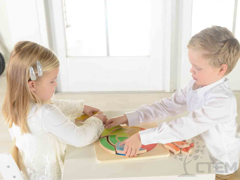На поверхности панели представлены 18 деревянных блоков, изготовленных из массива бука в 6 цветах, образующих спиральный круг. Дети могут исследовать различные комбинации из 18 частей головоломки. Отличная игрушка для стимулирования творческого воображения и визуального развития.