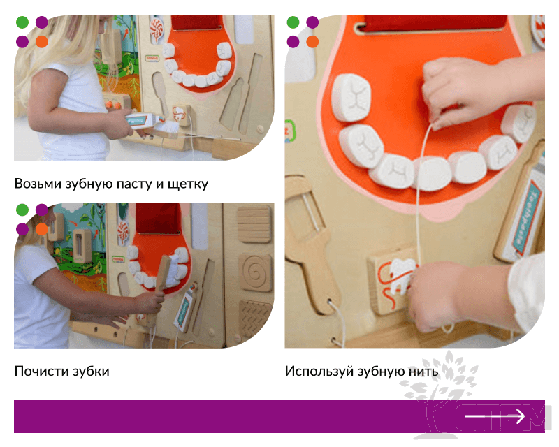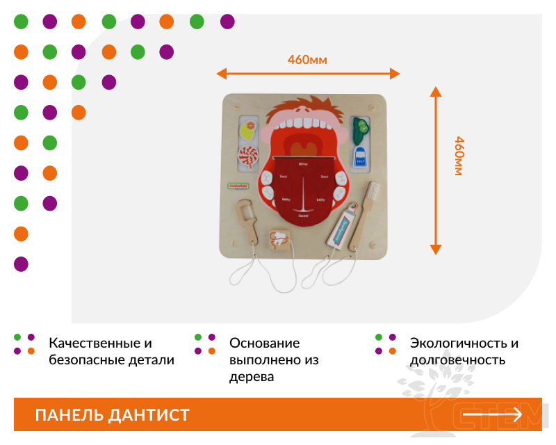 На лицевой части панели изображена ротовая полость человека, с нижним рядом зубов, выполненных из пластика. По центру ротовой полости размещен макет языка, выполненный из текстиля красного цвета. На языке изображены области, отвечающие за восприятия вкусов. В комплекте поставляется макет зубной щетки, зубной пасты, зубочистки, зубной нити, а также солонки, леденца, лимона и огурца. Данные элементы крепятся на доске в специальных углублениях.Панель выполнена из березовой фанеры толщиной 18мм.