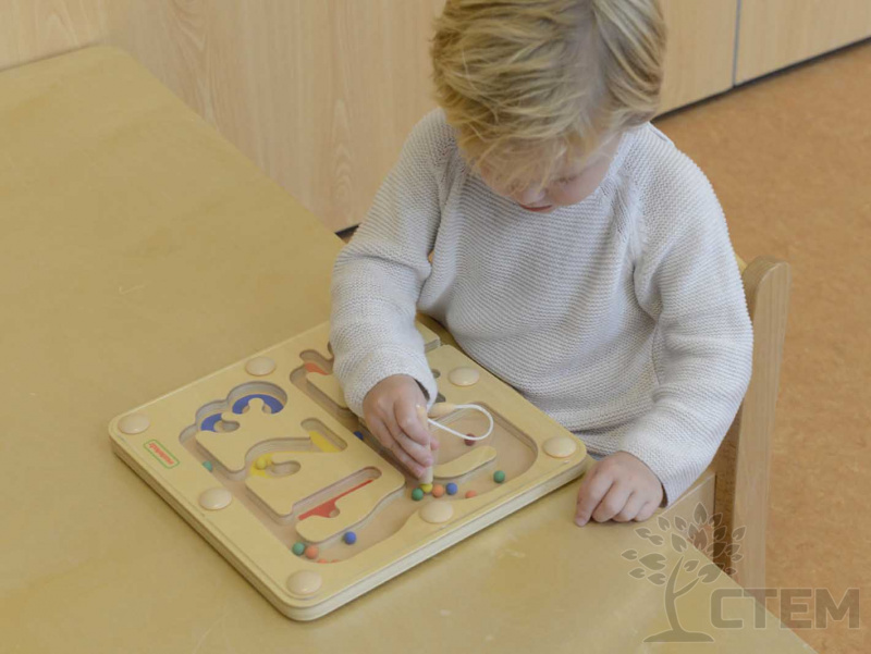 Панель выполнена из березовой фанеры, на лицевой стороне которой расположен магнитный лабиринт. Детям нужно перемещать цветные бусинки с помощью магнитной палочки на веревочке в соответствующие по цвету ячейки в форме цифр.