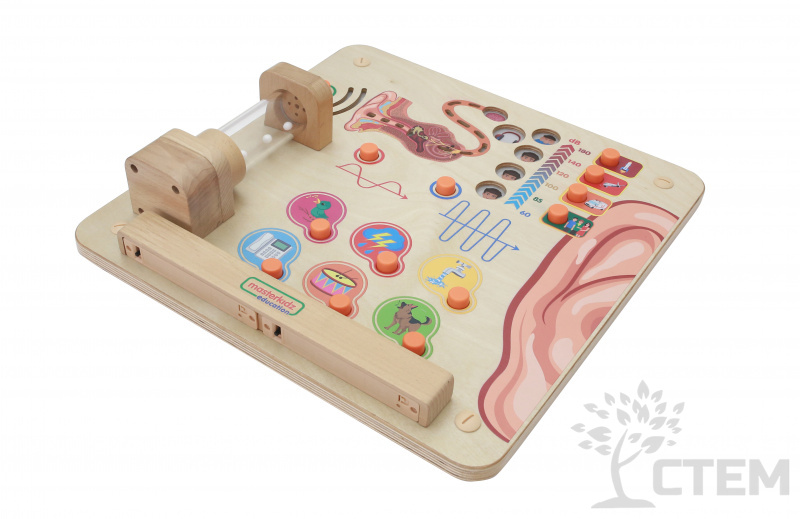 Настенная панель выполнена из березовой фанеры, на лицевой части которой расположена игра с изображением различных звуков людей, животных, птиц, техники. Есть кнопки высокого и низкого тона звука. Глядя на диаграммы звуковых волн, дети могут понять разницу между ними.