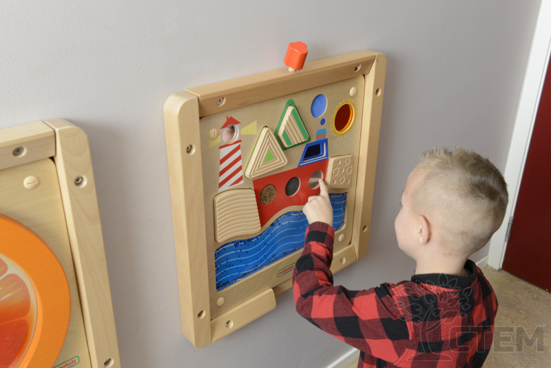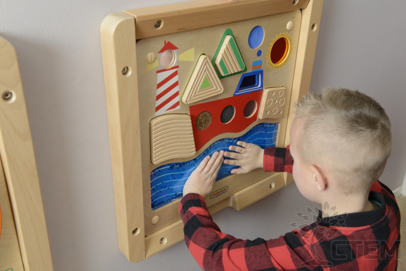 На лицевой части по основной площади, в углублениях расположены 4 образца деревянных плашек с различной текстурой поверхности, для тренировки тактильных навыков. Настенная панель выполнена из березовой фанеры толщиной 18мм., на лицевой части которой размещены углубления различной формы, в них размещены различные по тактильному восприятию материалы. Данная панель стилизованна под картину с океаном и идущим по нему кораблем.По углам панели размещены отверстия для крепления панели к стене