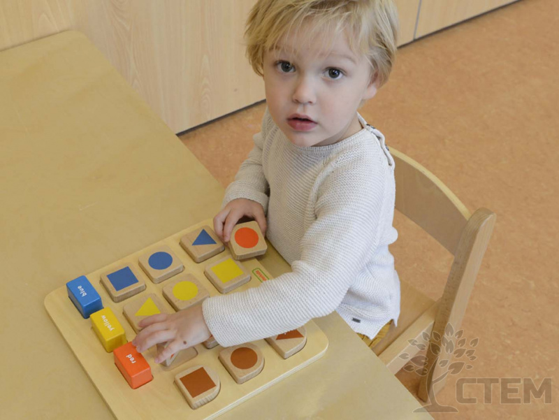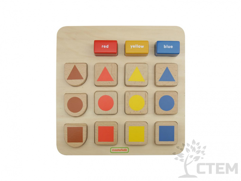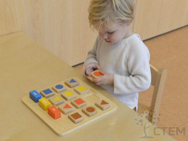 Основание панели из березовой фанеры, на лицевой части представлены деревянные блоки разных геометрических форм. Детям предлагается сопоставить блоки в соответствии с цветами в верхней части панели, либо разместить блоки правильно в соответствующие выемки - углубления.