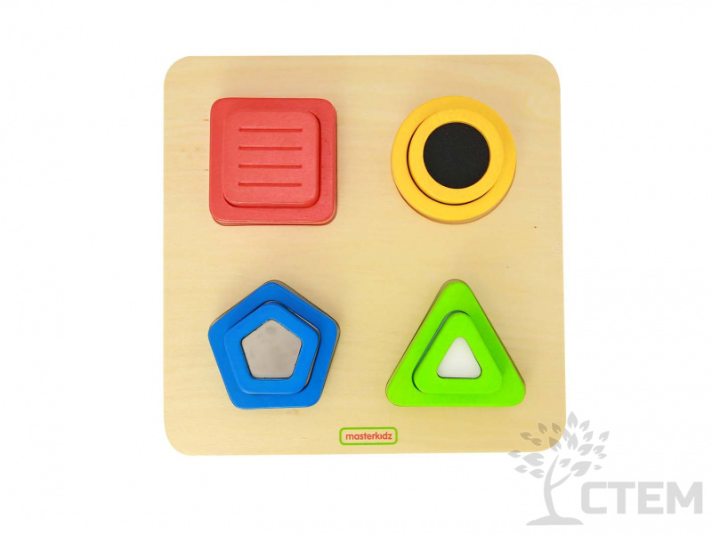 На лицевой части панели представлены 4 пары штабелируемых блоков с различными текстурами. Каждая пара имеет свою форму и цвет. Панель предназначена для развития тактильных и моторных навыков, логического мышления, а также для знакомства с формой и цветом.
