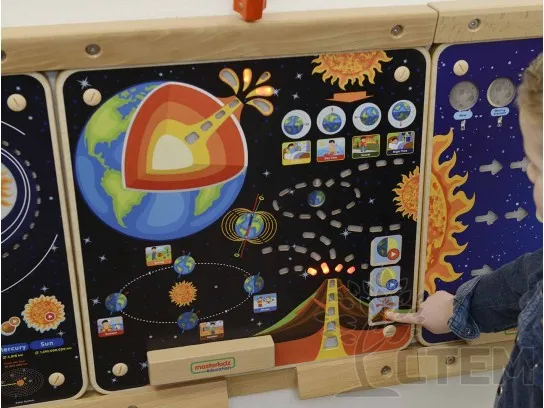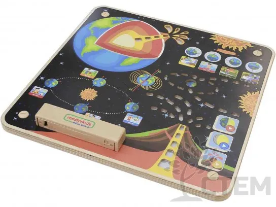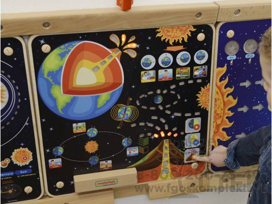 Панель знакомит детей с нашей планетой «Земля», наглядно демонстрирует, как Луна вращается вокруг Земли и как Земля вращается вокруг Солнца. Также, показывает внутреннюю структуру Земли и что происходит внутри вулкана, когда он извергается. Для лучшей демонстрации используются световые эффекты.