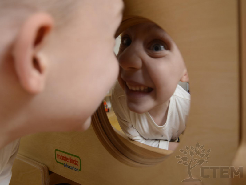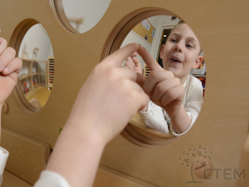 Пособие представляет из себя панель из березовой фанеры, в которую вмонтированы 5 зеркальных круглых поверхностей, с разной степенью кривизны. Общий размер панели 460*460 мм.