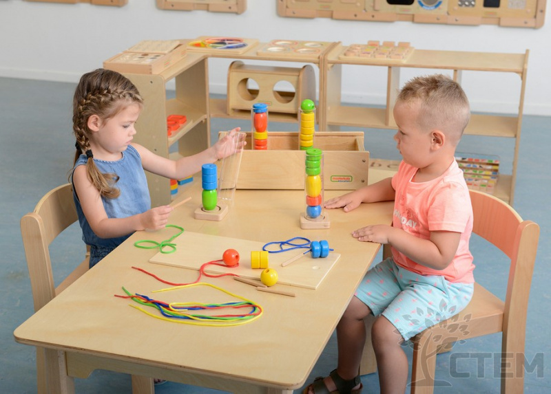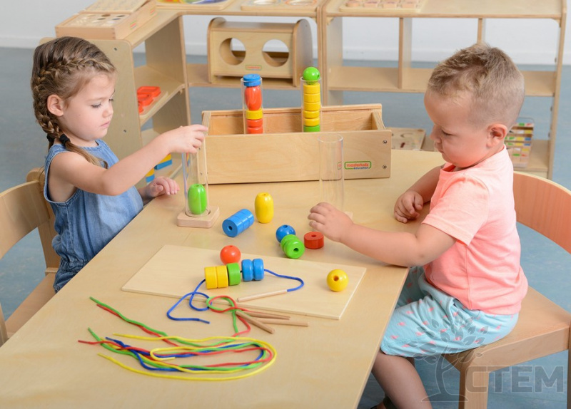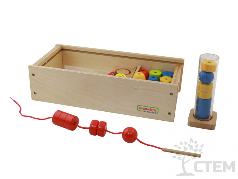 В набор входят разноцветные бусинки и шнуровки, а также 4 прозрачные пластиковые трубки для укладки бусинок. Бусинки имеют разную фому. Трубки с маркировкой, что облегчает для детей количественную оценку высоты каждой бусинки или комбинаций из них. Набор поставляется в прочном деревянном ящике для хранения.