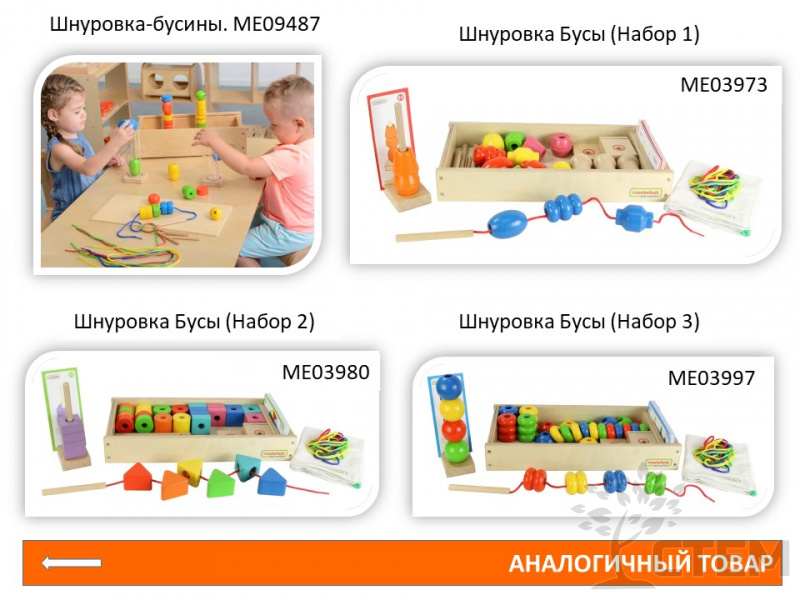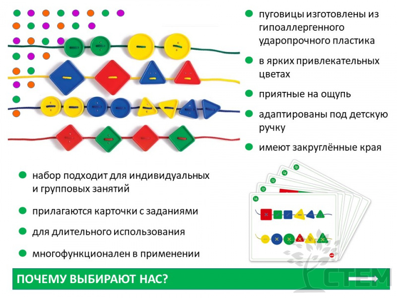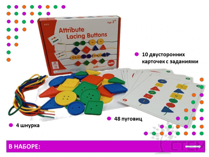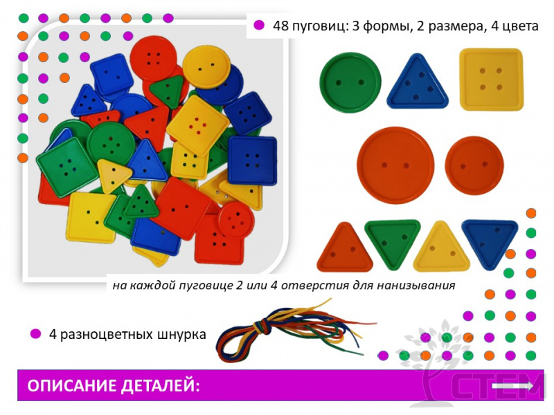 Шнуровка "Пуговицы" (3 формы, 2 размера, 4 цвета, 48 шт., 4 шнурка, 10 карточек).