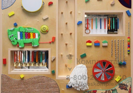 На корпусе панели совмещено множество звуковых и декоративных предметов различных форм и размеров, изготовленных из дерева, ткани, металла, пластика: вращающиеся диски, колокольчики, цепи, бубен, шарики, кубики. Углы обрамлены материалами различных фактур и формы. Панель способствует развитию тактильного, визуального и акустического восприятия; развивает осязательные навыки и интерактивную деятельность.