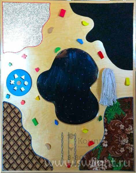 На корпусе панели размещены: светящееся «звездное небо» на ковролиновой основе, геометрические фигуры из оргстекла и дерева, безопасное зеркальное озеро с множеством светящихся точек, цепи, кубики, вращающиеся диски, лабиринт. По всей поверхности «разбросаны» яркие светящиеся точки, меняющие цвет. Источник подсветки: сверхъяркий светодиод: 5 Вт. Панель способствует развитию тактильного, визуального и акустического восприятия; развивает осязательные навыки и интерактивную деятельность.