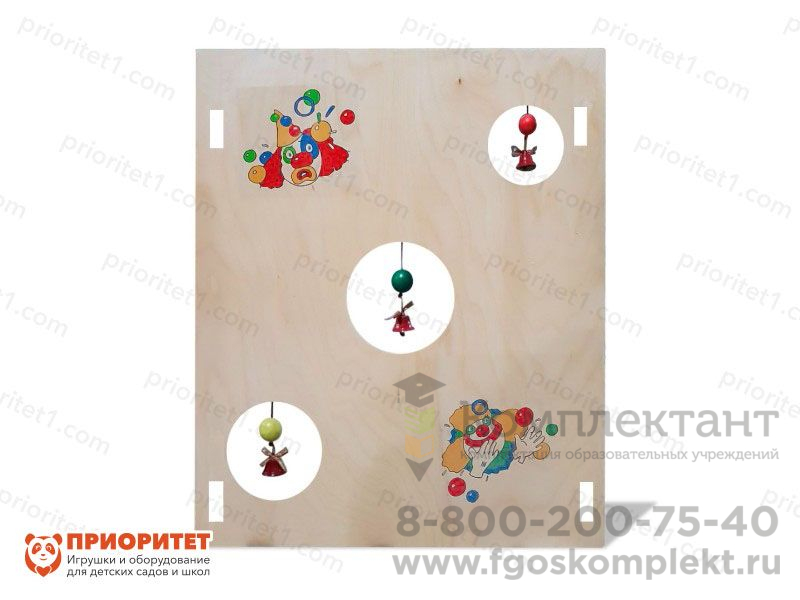 Яркая игровая доска позволит не только развлечься, но и потренировать свою меткость. У нее есть три круглых отверстия, в которых подвешены колокольчики. Над каждым колокольчиком есть шар определенного цвета. Отличаются и размеры отверстий. Чем меньше диаметр, тем сложнее попасть в мишень.
