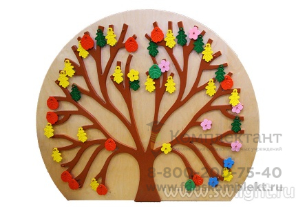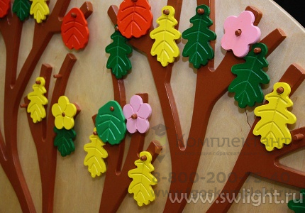 Тактильно-развивающая панель "Времена года" состоит из деревянного основания - ствола с ветками, на которые можно вешать листья и цветы. Цвет листьев - разный.