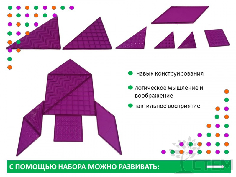Предназначен для развития тактильного восприятия, воображения, логического мышления, усидчивости и внимания, помогает создавать целое из частей и предвидеть при этом результат своей деятельности, знакомит с основами геометрии (понятие площадь, фигура, угол, сторона и т.д.).