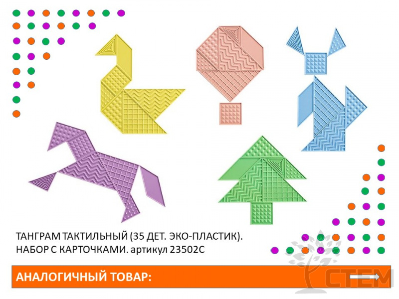 В комплект входят 35 тактильных фигур в 5-ти ярких цветах (7 различных тактильных поверхностей).
