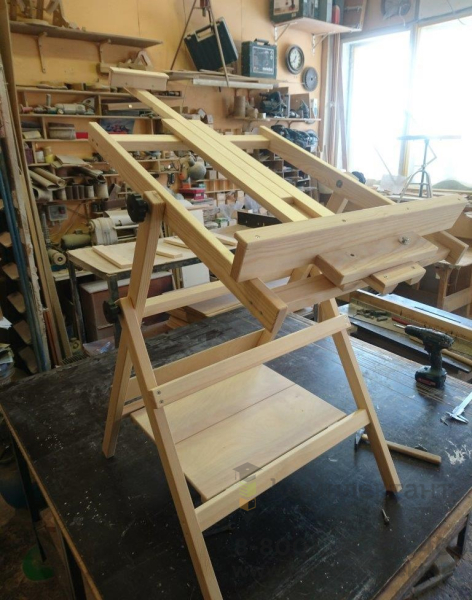 Приведение в рабочее положение осуществляется с помощью двух винтов-«барашков» М6. При этом внизу раскладывается на шести петлях полка для рабочих инструментов и материалов. рама состоит из двух трапециевидных реек по центру, внутри которых может выдвигаться центральная направляющая с верхним упором для планшетов или подрамников. Нижняя полка-опора планшета также перемещается по этим рейкам на нужную высоту и фиксируется под прямым углом ответной трапецией к направляющим.