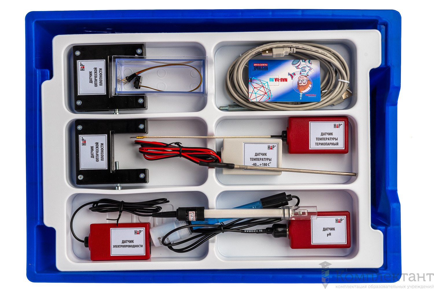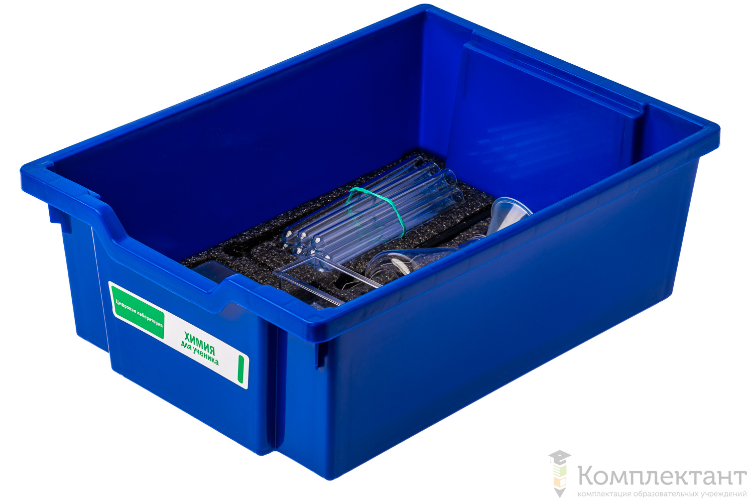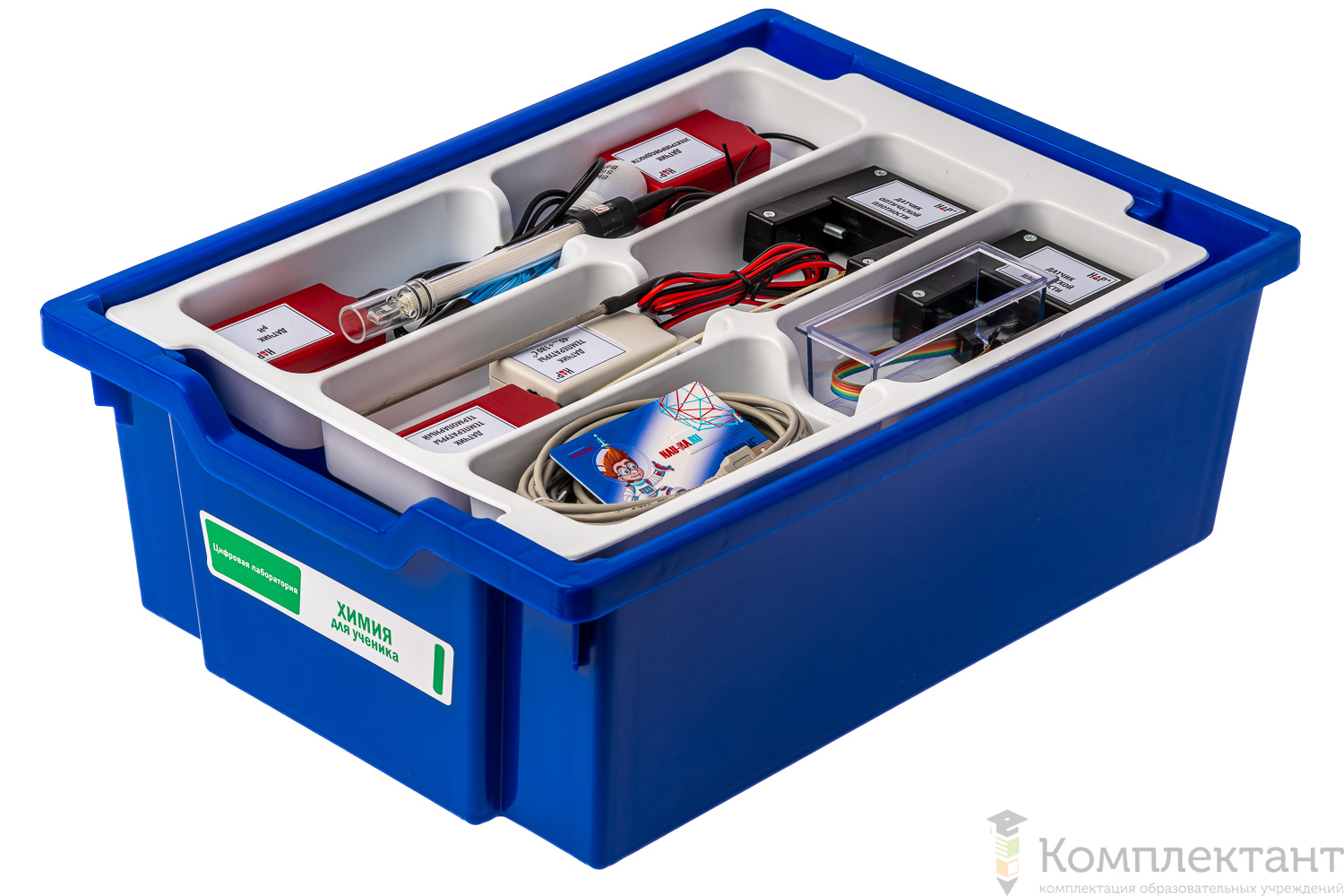 Цифровая лаборатория укомплектована в пластиковую систему хранения, которая закрывается прозрачной пластиковой крышкой на защелках для обеспечения наблюдения за содержимым. Комплект оборудования и датчики в системе хранения располагаются на ложементах.