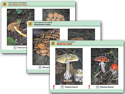 Пособие состоит из 8 полноцветных таблиц, напечатанных на картоне и ламинированных глянцевой пленкой. Представлено 10 фотографий съедобных грибов (белый гриб, подберезовик, подосиновик, масленок, лисичка, сыроежка, опенок летний, опенок осенний, шампиньон, груздь черный), 4 фотографии ядовитых грибов (бледная поганка, мухомор красный, мухомор пантерный, сатанинский гриб) и 2 фотографии несъедобных грибов (перечный гриб, чешуйчатка огненная), указаны их видовые названия.