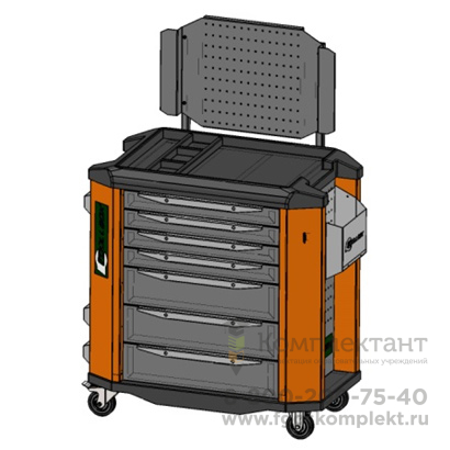 В заднюю стенку тележки встроен складной перфорированный экран, на который легко устанавливаются различные полки, держатели и крючки для инструмента (плоскогубцев, ключей, отверток, электроинструментов и т.п.)