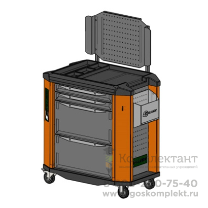 В заднюю стенку тележки встроен складной перфорированный экран, на который легко устанавливаются различные полки, держатели и крючки для инструмента (плоскогубцев, ключей, отверток, электроинструментов и т.п.)